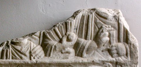 Im Hauptbild Familie: Brustbilder von drei Erwachsenen und einem Kind. Links Knabe (vor Frau ?): Sagum. Frau oder Jüngling: in der Rechten Apfel. Rechts Mann: Ärmeltunica mit Borte am Ärmelrand,Sagum mit Fransen, in der Linken Rolle (volumen).