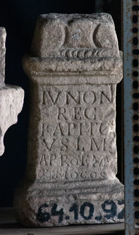 - Iunoni / Reg(inae) / Kapito / v(otum) s(olvit) l(ibens) m(erito) / Apro et Ma/ximo co(n)s(ulibus)