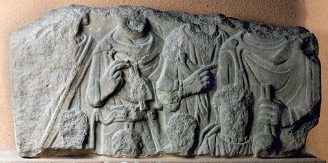 - Familie: Ganzfiguren (?) von vier Erwachsenen und fünf Kindern. Oben von links Frau: Haarnetz, Tunica, Mantel mit Randborte. Mann (Soldat): Ärmeltunica, Sagum, Zwiebelknopffibel, Gürtel mit Ringschnalle und Beschlägen, in der Linken Rolle (volumen). Frau: Tunica, Mantel, Halskette. Mann: Ärmeltunica, Sagum mit Fransen, Scheibenfibel, Fingerring, in der Linken Rolle. Von den vorn stehenden Kindern nur Kopfumrisse sichtbar, das zweite von rechts Mädchen mit Halskette, Ohrgehängen. Auf den Nebenseiten Weinranken.
