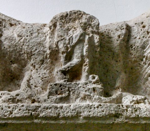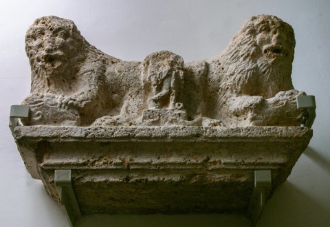 - Löwen, mythische Figur: auf profiliertem Gesims liegende Löwen, in den Pranken Widderköpfe. Zwischen ihnen stehender Attis, auf Pedum gestützt.