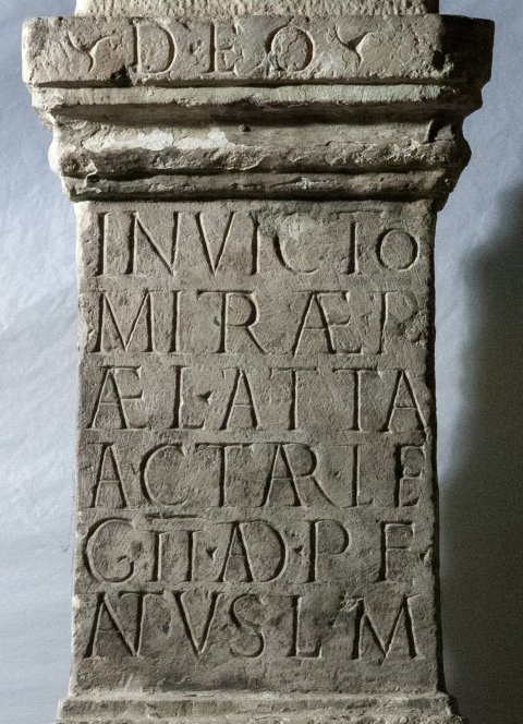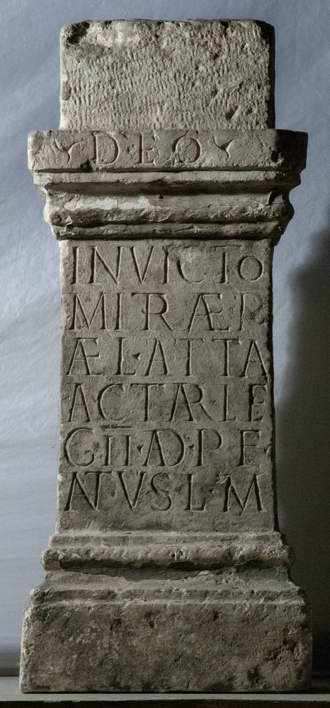 - Deo // Invicto / Mit(h)rae P(ublius) / Ael(ius) Atta / actar(ius) le/g(ionis) II ad(iutricis) p(iae) f(idelis) / Ant(oninianae) v(otum) s(olvit) l(ibens) m(erito)