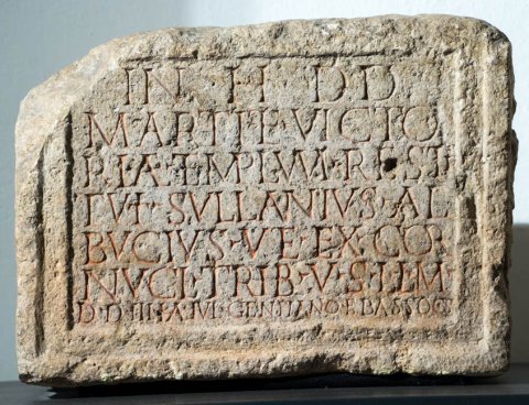 - In h(onorem) d(omus) d(ivinae) / Marti et Victo/riae templum resti/tuit Sullanius Al/bucius vet(eranus) ex cor/nucl(ario) trib(uni) v(otum) s(olvit) l(ibens) l(aetus) m(erito) / d(e)d(icatum) III Kal(endas) Iul(ias) Gentiano et Basso co(n)s(ulibus)