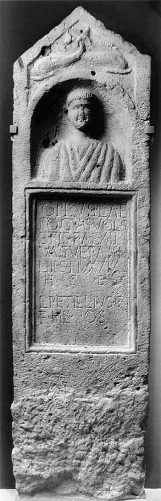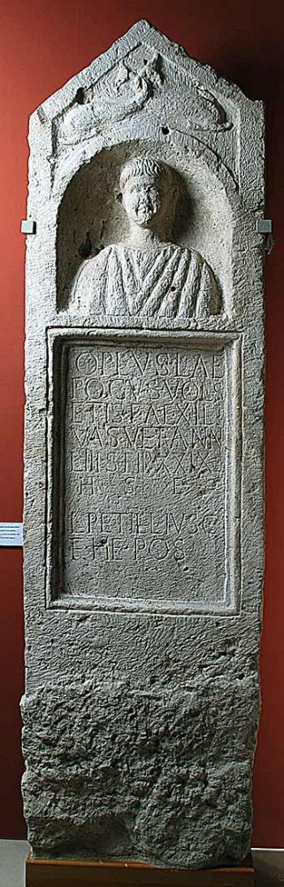 - Oplus Lae/pocus Vols/etis f(ilius) Aexil/vas vet(eranus) ann(orum) / LIII stip(endiorum) XXIX / h(ic) s(itus) e(st) / L(ucius) Petillius C(aii) / f(ilius) he(res) pos(uit)