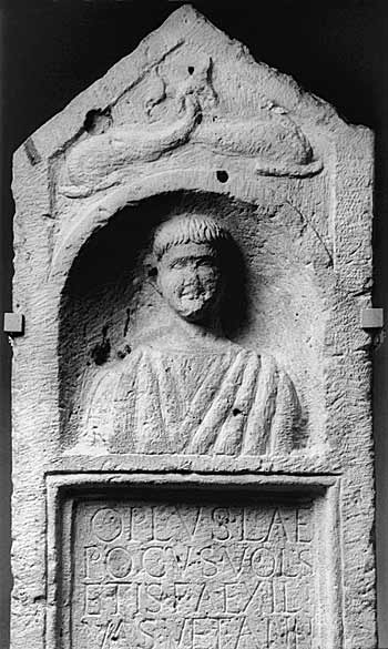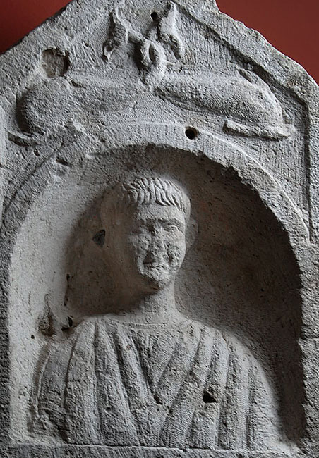 - Im Giebel zwei Delphine. Darunter Bogennische mit Brustbild eines Mannes: bartlos, gesträhntes Haar, Sagum, Scheibenfibel.
