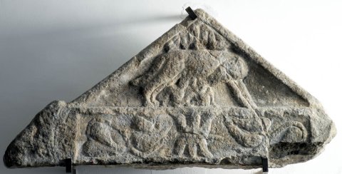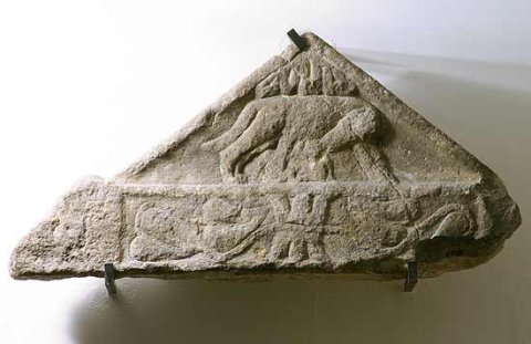 - Im Giebelfeld Mythos: Lupa Capitolina, darunter Fries mit doppeltem Blattkelch, von dem Blattranken ausgehen. In der Giebelspitze Blatt.