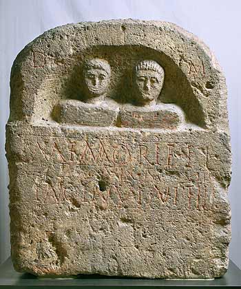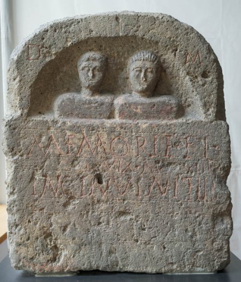 Auf der Vorderseite in rundbogiger Nische Büsten von 2 Kindern (Mädchen und Knabe).