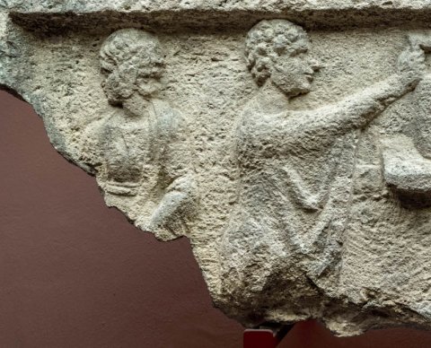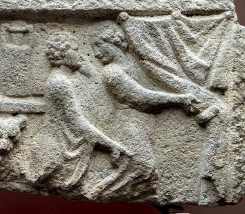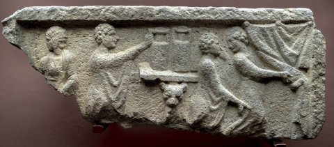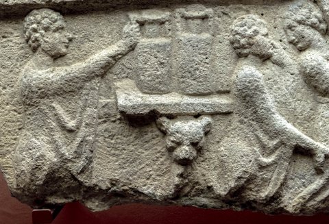 - Einfach gerahmtes Rechteckfeld, in der Mitte Tisch mit Fuß aus Löwenprotome. Auf dem Tisch drei Henkelflaschen. Von links greift ein Mann im Mantel nach einer Flasche, hinter ihm nach links gewandte Frau in gegürteter Tunica und Mantel. Rechts vom Tisch folgt ein Mann in weitärmeligem Gewand einer Frau im Ärmelkleid, die sich zu ihm umdreht und nach dem Vorhang greift, der das Bild rechts abschließt.