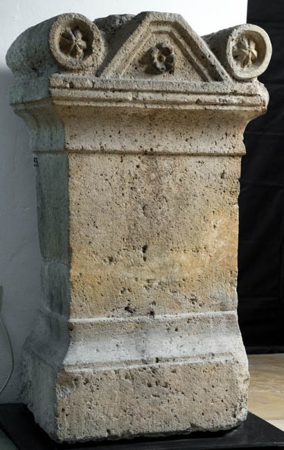 - Über profilierter Deckplatte Volutenpolster (pulvini) mit Rosetten, dazwischen gekappter gerahmter Giebel mit Rosette.