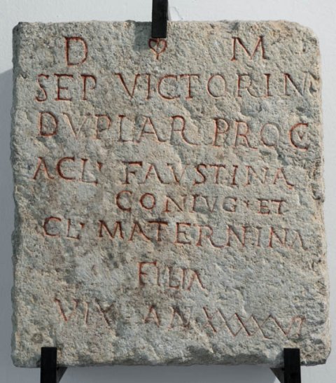 - D(is) M(anibus) / Sep(timio) Victorino / dupl(ario) procu(rantibus) / Acil(ia) Faustina / coniug(e) et / Cl(audia) Maternina / filia / vixit an(nos) XXXXVI