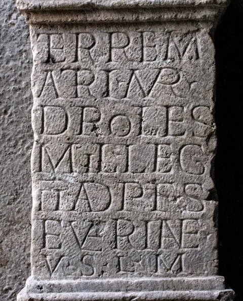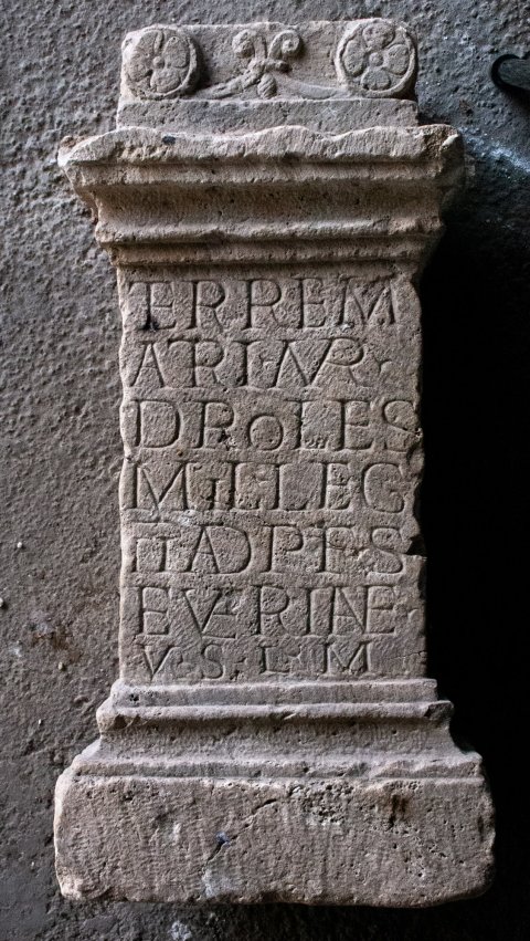 - Terr(a)e M/atri Aur(elius) / Droles / mil(es) leg(ionis) / II Ad(iutricis) p(iae) f(idelis) S/everian(a)e / v(otum) s(olvit) l(ibens) m(erito)