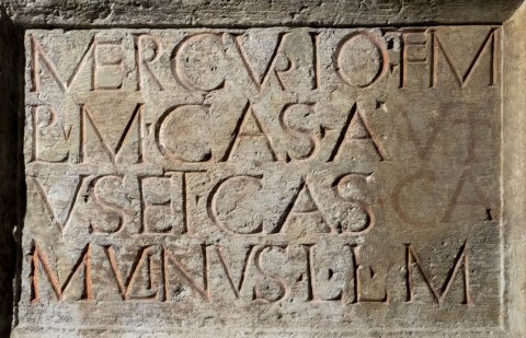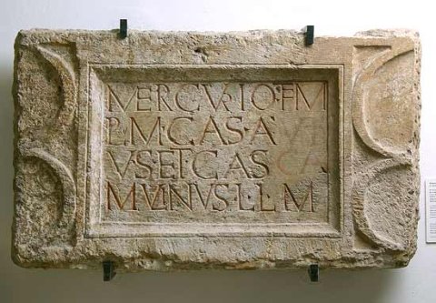 - Mercurio te[m]/plum Cas(sius) A[vit?]/us et Cas(sius) [Ca?]/mulinus l(ibentes) l(aeti) m(erito)