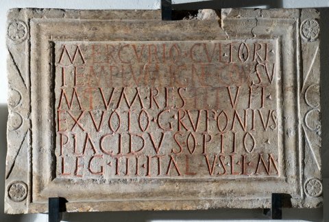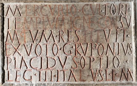- M[ercurio cul]tori / t[emplum igne con]su/m[ptu]m res[titu]it / [e]x voto G(aius) Rufonius / Placidus optio / leg(ionis) III Ita[l(icae) v(otum)] s(olvit) l(ibens) l(aetus) m(erito)