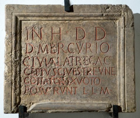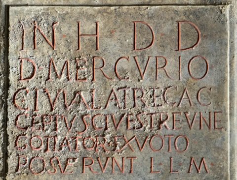 - In [h(onorem) d(omus) d(ivinae)] / d(eo) Merc[urio] / C(aius) Iuval(ius) Atr() et C(aius) [Ac]ceptus cives Tr(everes) [ne]/gotiator(es) ex v[oto ---] / posu[erunt]