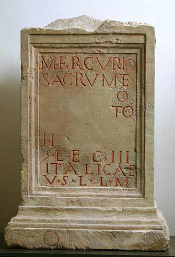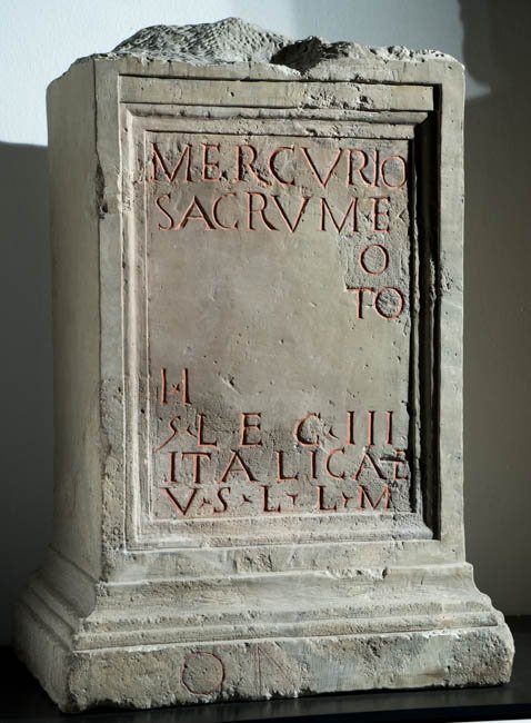 - Mercurio / s[acru]m e/[x vot]o / [suscep]to / [ -----]/i[--- mile]/s leg(ionis) [III] / Italicae / v(otum) s(olvit) l(ibens) l(aetus) m(erito)
