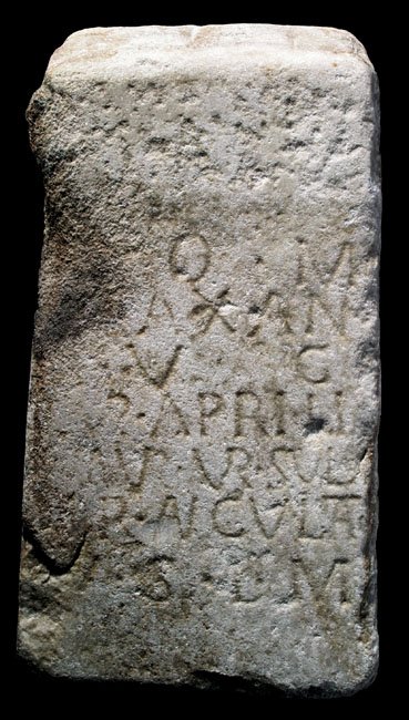 - [I(ovi)] O(ptimo) M(aximo) / [et] Saxan(o) // [A]ug(usto) / [Au]r(elius) Aprili/[s] Aur(elius) Ursul(us) / [Au]r(elius) Angulat(us) / v(otum) s(olverunt) l(ibentes) m(erito)