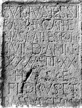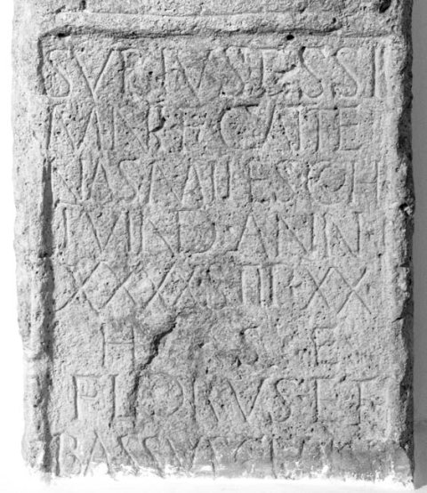 - Surius Essi/mni f(ilius) Catte/nas miles coh(ortis) / I Vind(elicorum) ann(orum) / XXXX stip(endiorum) XX / h(ic) s(itus) e(st) / Florus et / Bassus Cere[---