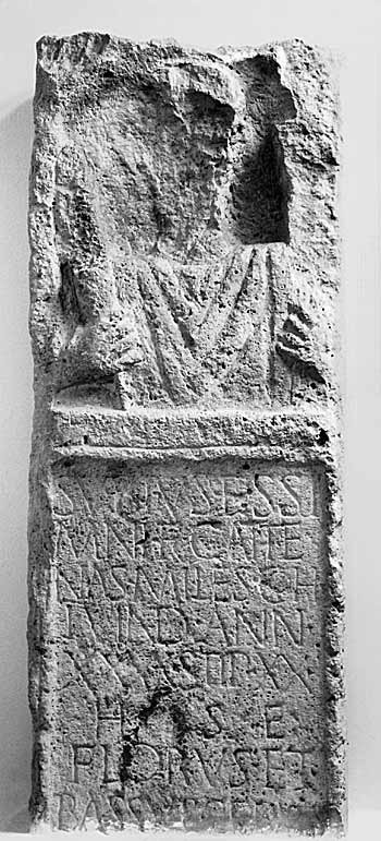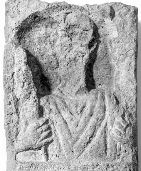 - In Bogennische Brustbild eines Mannes: Sagum mit Fransen, in der Rechten spindelförmiger Gegenstand mit Spitze unten.