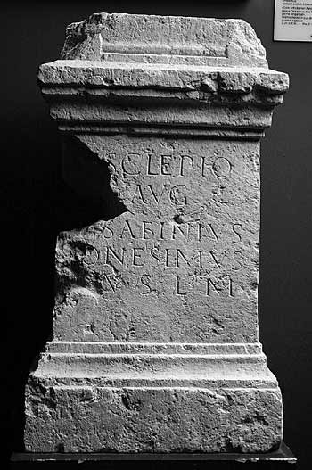 - Asclepio / Aug(usto) / Q(uintus) Sabinius / Onesimus / v(otum) s(olvit) l(ibens) m(erito)