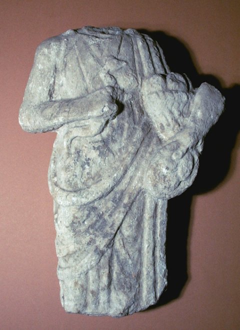 - Mythische Figur (Asklepios-Aesculapius, Hygieia-Hygia): Links Hygieia in Chiton und Mantel, in der Rechten Schlange, im linken Arm Korb mit Früchten. Vor ihrer Linken rechte Hand des Asklepios mit Fruchtschale. Asklepios im halblangen Mantel um Hüften und linken Arm, in der Linken Stab mit Schlange.