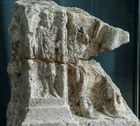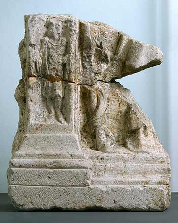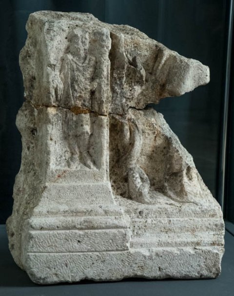 Auf der Vorderseite mythische Figur (Asklepios, Silvanus ?) : Im Hauptbildfeld Reste einer Figur (Mantelfalten) mit Stab, um den sich Schlange windet. Links Pilasterrahmen mit stehendem Mann in kurzer Tunica und Sagum, in der Rechten Winzermesser (Silvanus ?). Unten profilierter Rahmen.