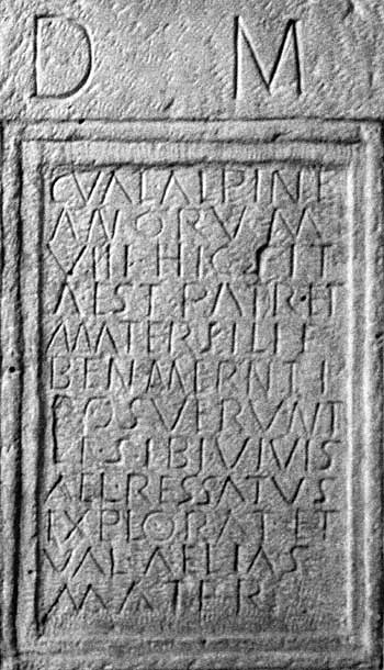 - D(is) M(anibus) / C(aiae) Val(eriae) Alpin(a)e / an(n)orum / VIII hic sit/a est pat(e)r et / mater fili(a)e / ben(e)mer(e)nti / posuerunt / et sibi vivis / Ael(ius) Ressatus / explorat(or) et / Val(eria) Aelias / mater