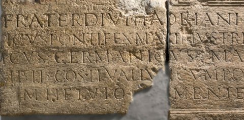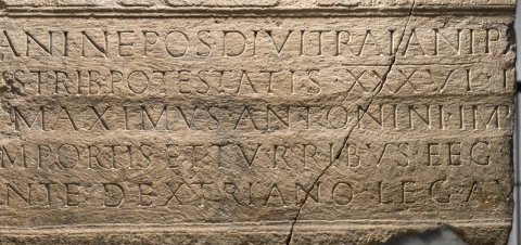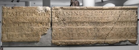 - [Imp(erator) Caesar divi Antonini Pii filius divi Veri Parthici Maximi] frater divi Hadriani nepos divi Traiani Pa[rthici pronepos divi] / [Nervae abnepos M(arcus) Aurelius Antoninus Aug(ustus) Germanicus Sarma]ticus pontifex maximus trib(uniciae) potestatis XXXVI i[mp(erator) VIIII co(n)s(ul) III p(ater) p(atriae) et] / [Imp(erator) Caesar M(arcus) Aurelius Commodus Antoninus Aug(ustus) Sarmat]icus Germanicus Maximus Antonini Imp(eratoris) [filius divi Pii nepos divi] / [Hadriani pronep(os) divi Traiani Parthici abn(epos) divi Nervae adn(epos) trib(unicia) pot(estate) IIII i]mp(erator) II co(n)s(ul) II vallum cum portis et turribus <l=E>eg(ioni) I[II Italicae Concordi] / [fecerunt curante] M(arco) Helvio C[le]mente Dextriano leg(ato) Au[gg(ustorum) leg(ionis) eiusdem]