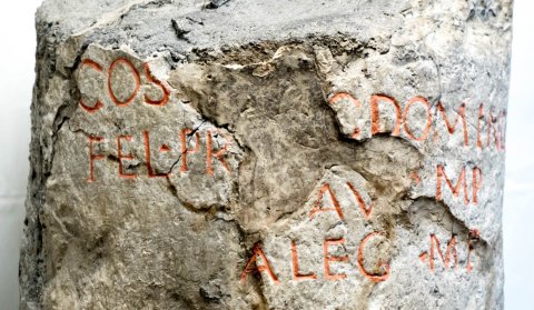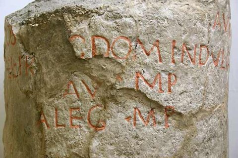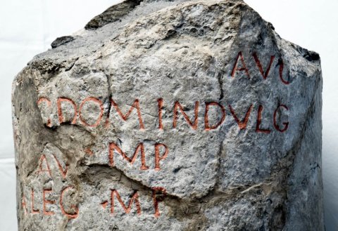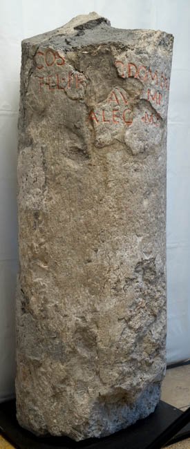 - [Imp(eratori) Caes(ari) L(ucio) Sept(imio) Sever(o)] / [Pio Pert(inaci) Arab(ico) Adiab(enico) Part(hico)] / [Brit(annico) p(ontifici) m(aximo) trib(unicia) pot(estate) III imp(eratori) VII co(n)s(uli) II] / [et Imp(eratori) Caes(ari) M(arco) Aur(elio) Anton]/[ino Pio Invict(o) Aug(usto) Part(hico) m(aximo)] / [Brit(annico) m(aximo) p(ontifici) max(imo) trib(unicia) pot(estate) XVIII imp(eratori) IIII] / co(n)s(uli) [IIII proco(n)s(uli) fortissim(o)] Aug(usto) / Fel(icissimo) pr[in]c(ipi) dom(ino) indulg(entissimo) / [a]b Aug(usta) m(ilia) p(assuum) [---] / a leg(ione) m(ilia) p(assuum) [---]