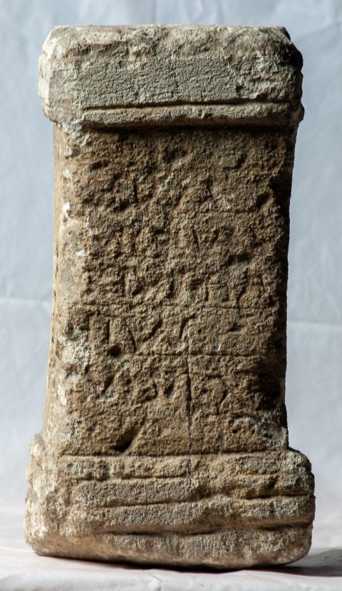 - bestoßen, Reste der Stuckierung, geritzte Zeilen