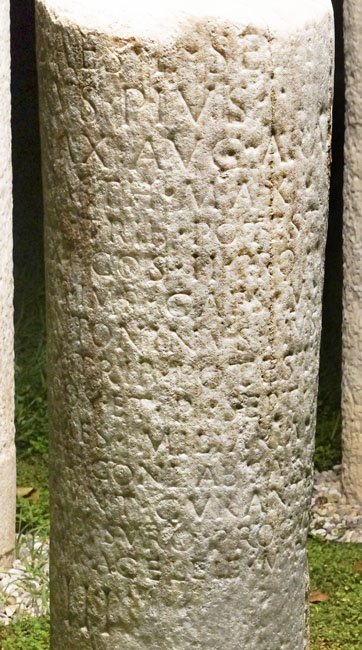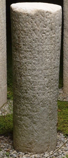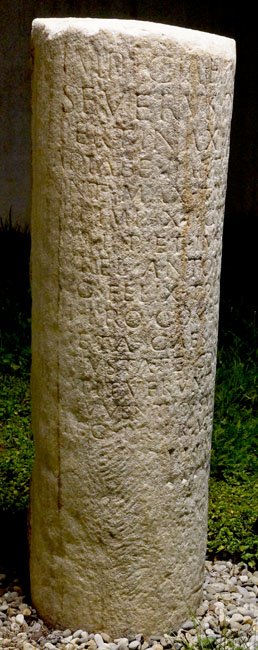 - Imp(erator) Caes(ar) L(ucius) Sept(imius) / Severus Pius / Pertinax Aug(ustus) Arab(icus) / Adiabe(nicus) Parth(icus) max(imus) / pont(ifex) max(imus) trib(unicia) potest(ate) / VIIII imp(erator) XI(I) co(n)s(ul) II pro/co(n)s(ul) p(ater) p(atriae) et Imp(erator) Caes(ar) M(arcus) / Aurel(ius) Antoninus Pius / Aug(ustus) Felix trib(unicia) potest(ate) / III(I) proco(n)s(ul) et P(ublius) Sept(imius) / Geta Caes(ar) miliaria / vetustate conlabsa(!) / restituerunt curante / M(arco) Iuventio Suro Proculo / leg(ato) pr(o) pr(aetore) a Celei<a=E> m(ilia) p(assuum) / III
