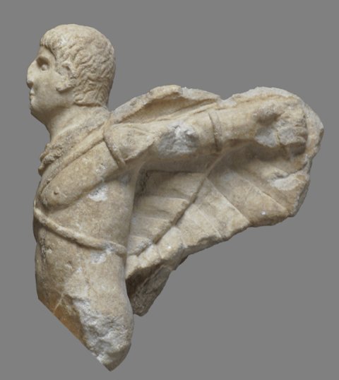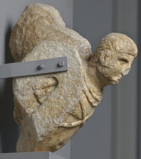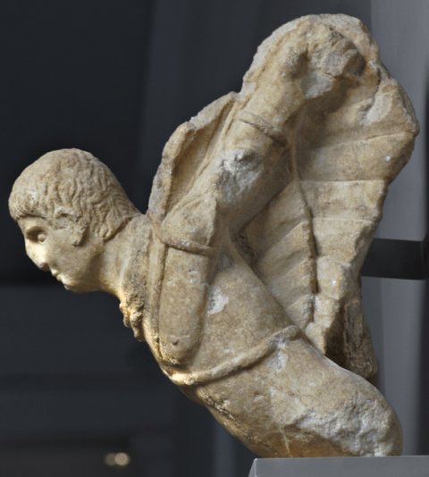 - Akroter (?). Mythische Figur : nackter Ikarus mit Mäntelchen um die Schultern und zurückgestreckten Armen, an denen Flügel mit Riemen befestigt sind, die sich über der Brust kreuzen.