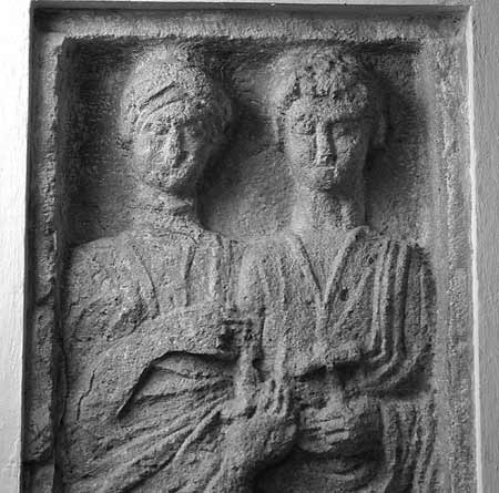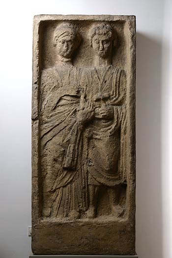 - In Rechtecknische zwei stehende Ganzfiguren (Ehepaar). Links Frau: trajanische Frisur, Halskette, Tunica und Mantel. Rechts Mann: bartlos, halblange Tunica, Mantel, in der Linken Hammer.