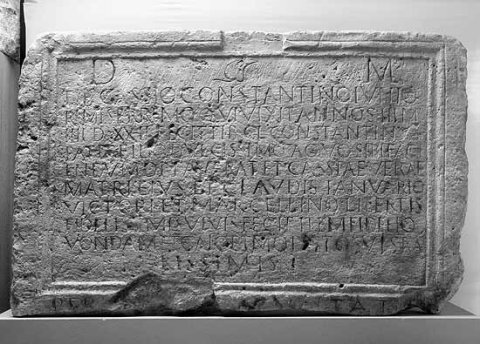 - D(is) M(anibus) / Tib(erio) Cassio Constantino iunio/ris miserrrimo qui vixit annos III m(enses) / IIII d(ies) XXII fecit Tib(erius) Cl(audius) Constantinus / pater filio dulcissimo a quo sibi faci/endum optaverat et Cassiae Verae / matri eius et Caludis Ianuario / Victori et Marcellino libertis / fidelissimis vivis fecit item Fideli q/uondam et Gaio et Modesto suis ra/rissimis / perpetuae securitati