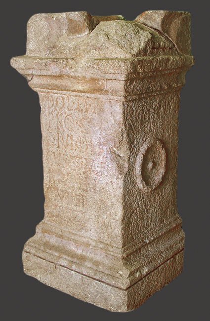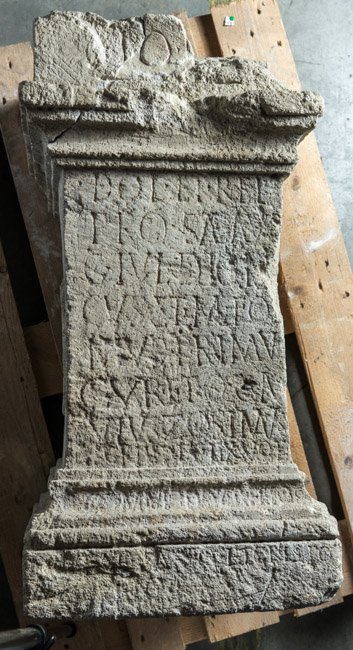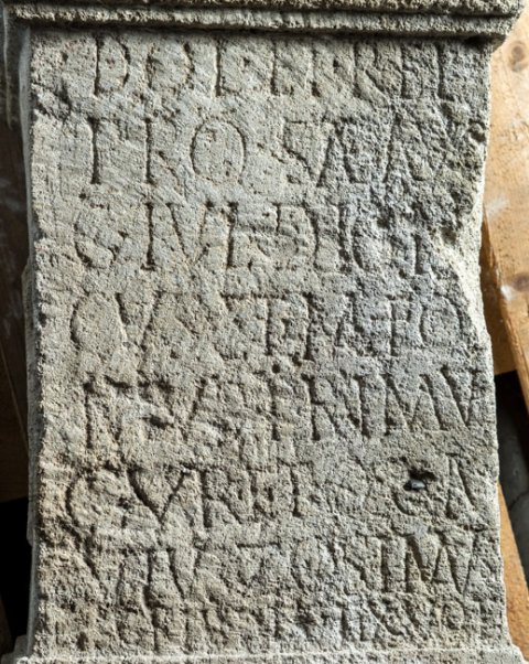 - I(ovi) O(ptimo) M(aximo) / Dol(icheno) et Hel(iopolitano) / pro sal(ute) Aug(usti) / G(aius!) Iul(ius) Dioni/cus et M(arcus) Fol/nius Primu(s) / cur(atores) et Q(uintus) Ga/vius Zosimus / scriba ded(icaverunt) ex vot(o) / [Imp(eratore)] Comm[od]o Aurelio co(nsule) / [s]ac(erdotibus) [B]asso et Crispo