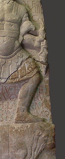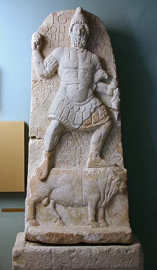 - Mythische Figur (Jupiter Dolichenus) : ungerahmtes, oben abgerundetes Bildfeld mit vorspringender Standleiste, darauf der auf dem Stier stehende Gott in Panzer und phrygischer Mütze, um die Taille Binde, unter der linken Achsel Schwertgriff mit Adlerkopf, in der Linken Blitzbündel, in der Rechten ursprünglich Doppelaxt. Den Bildhintergrund füllt die Inschrift. Postament (H. 093) mit Sockel- und Deckprofil, Rückseite roh behauen.