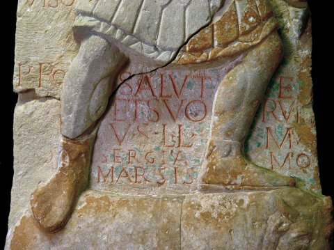 - I(ovi) o(ptimo) m(aximo) / Dolic(h)eno / Atilius / Primus/ (centurio) leg(ionis) / XIIII / g(eminae) / ex evo/cato / leg(ionis) / X p(iae) f(idelis) / ex / viso / pro salute / sua et suorum / v(otum) s(olvit) l(ibens) l(aetus) m(erito) / Sergia domo / Marsis