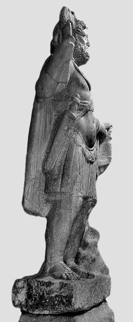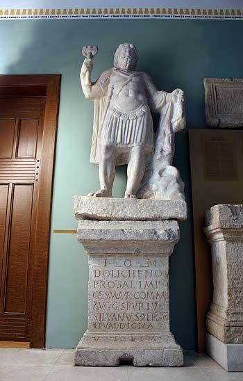 - Mythische Figur (Jupiter Dolichenus): Auf rechteckiger Plinthe stehender Gott: Panzer mit Feldherrenbinde, Schwertgurt mit Schwert, Mantel mit Scheibenfibel auf der rechten Schulter, phrygische Mütze, Sandalen. In der Linken Blitzbündel, in der Rechten Doppelaxt. Neben dem linken Fuß Stierkopf.