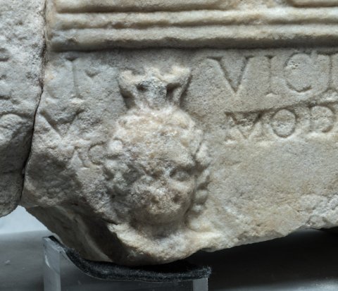 - In der Mitte des Schriftfeldes mythische Figur (Venus ?, Genius ?) : Kopf mit gelockter Frisur und Mauerkrone.