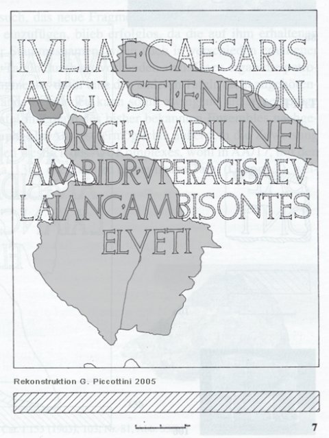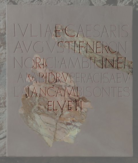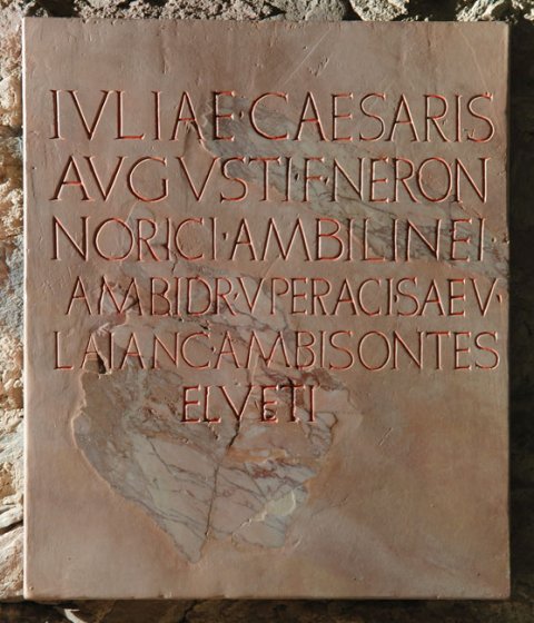 - [Iuli]ae Ca[esaris] / Au[g]usti f(iliae) Neron(is) / [N]oric[i Am]bilinei / [A]mbidr(avi) Up[eraci Sae]v(ates) / [L]aianc(i) Amb[isont(es)] / (H)elveti(i)