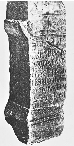 - I(ovi) o(ptimo) m(aximo) d(is) d(eabusque) / C(aius) Restitutius / Restitutianus / c(enturio) leg(ionis) et Iulia / Honorata / coniux eius / v(otum) s(olverunt) l(ibentes) l(aeti) m(erito)