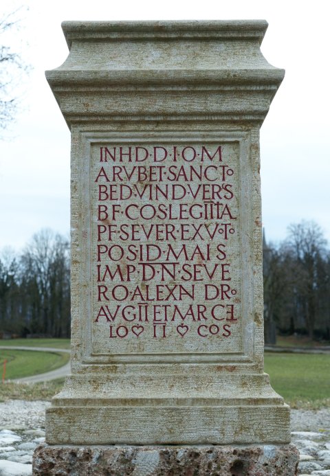 - In h(onorem) d(omus) d(ivinae) I(ovi) O(ptimo) M(aximo) / Arub(iano) et sancto / Bed(aio) Vind(ius) Verus / b(ene)f(icarius) co(n)s(ularis) leg(ionis) II Ital(icae) / p(iae) f(idelis) Sever(ianae) ex voto / pos(uit) Id(ibus) Mais / Imp(eratore) d(omino) n(ostro) Seve/ro Alexandro / Aug(usto) II et Marcel/lo II co(n)s(ulibus)