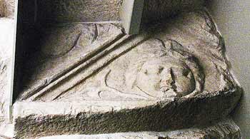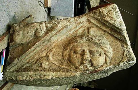 - Eingeschriebener Giebel mit Gorgoneion zwischen Blüten, auf den Schrägen Meerwesen (Hippokamp).