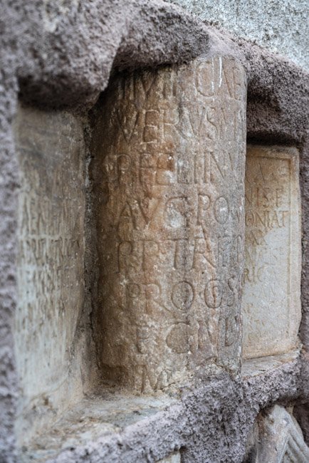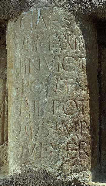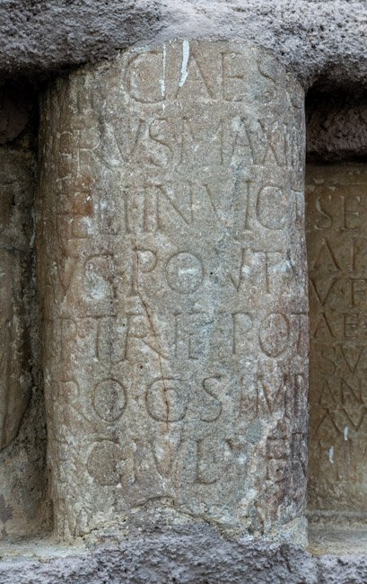 - Imp(erator) Caes(ar) G(aius) Iul(ius) / Verus Maximinus / p(ius) feli(x) invictus / Aug(ustus) pont(ifex) maxi(mus) / p(ater) p(atriae) trib(unicia) pote(state) co(n)s(ul) / proco(n)s(ul) imp(erator) bis / et G(aius) Iul(ius) Verus / Max[i]mus / [ ---