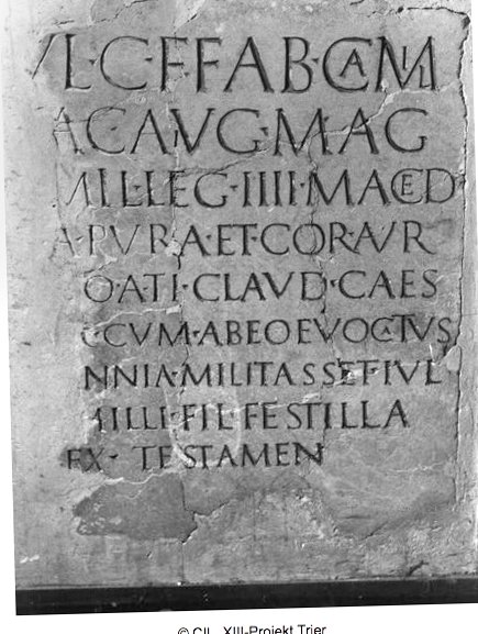 - [C(aio) I]ul(io) C(ai) f(ilio) Fab(ia) Camil/[lo s]ac(erdoti) Aug(usti)/ mag(no) / [trib(uno)] mil(itum) leg(ionis) IIII Maced(onicae) / [hast]a pura et cor(ona) aur(ea) / [dona]to a T(iberio) Claud(io) Caes(are) / [Aug(usto) ite]r(um) cum ab eo evocatus / [in Brita]nnia militasset Iul(ia) / [Ca]mili fil(ia) Festilla / ex testamen(to)