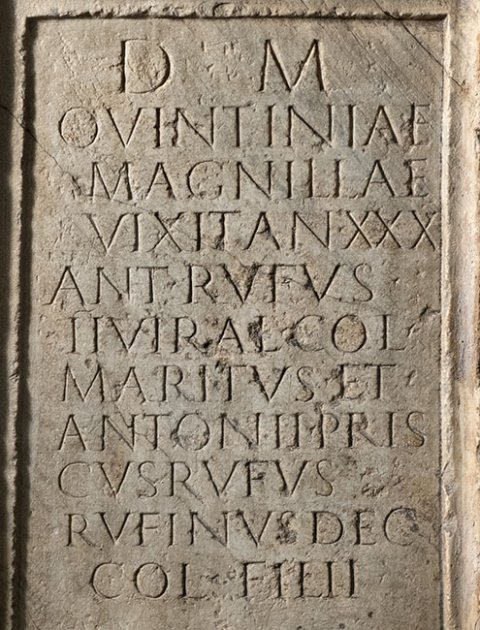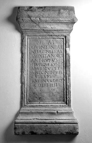 - D(is) M(anibus) / Quintiniae / Magnillae / vixit an(nos) XXX / Ant(onius) Rufus / II viral(is) / col(oniae) / maritus et / Antonii Pris/cus Rufus Rufinus dec(uriones) / col(oniae) filii