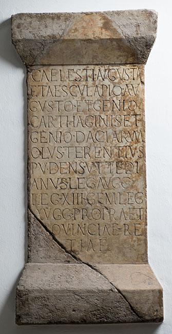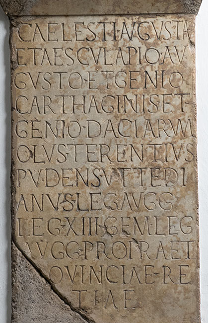- Caelesti Augustae / et Aesculapio Au/gusto et Genio / Carthaginis et / Genio Daciarum / Olus Terentius / Pudens Uttedi/anus leg(atus) Augg(ustorum) / leg(ionis) XIII gem(inae) leg(atus) / Augg(ustorum) pro praet(ore) / [ pr]ovinciae R(a)e/ticae
