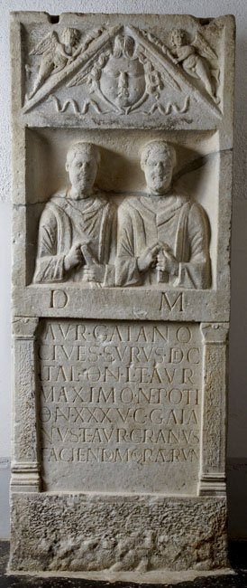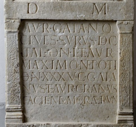 - D(is) M(anibus) / Aur(elio) Gaiano / cives Surus dec(urioni) / Ital(icae) o(bito) an(norum) L et Aur(elio) / Maximo nepoti / o(bito) an(norum) XXXV C(aius) Caia/nus et Aur(elius) Granus / faciendum qura(v)erun(t)