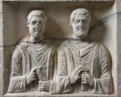 - Eingeschriebener Giebel mit Gorgoneion, auf den Schrägen Erot (Genius) mit Fackel. Im Hauptbild Brustbilder von zwei Männers: bärtig, Ärmeltunica, Paenula, Fingerring.