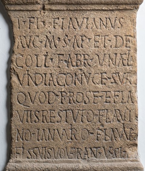 - I(ovi) o(ptimo) m(aximo) aeterno / T(itus) Fl(avius) Flavianus / Aug(ustalis) m(unicipii) S(eptimii) Ap(uli) et dec(urio) / coll(egii) fabr(um) un(a cum) Aelia / Vindia coniuge sua / quod pro se et Fla/viis Restuto Flavia/no Ianuario Flaviano / fili(i)s suis voverant v(otum) s(olverunt) l(ibentes) m(erito)