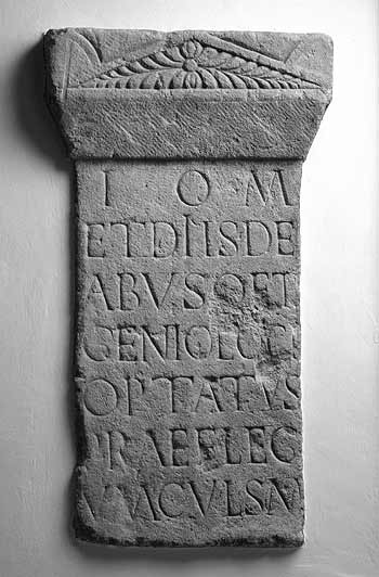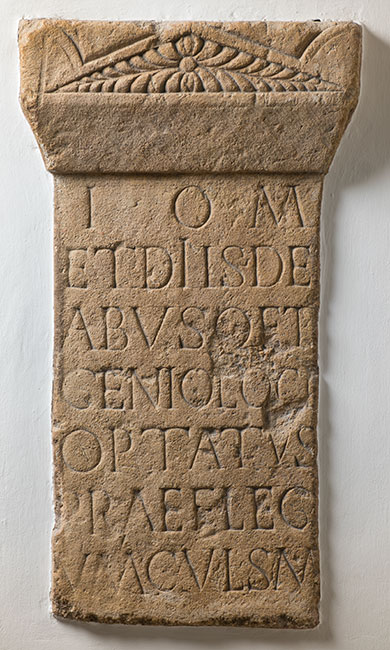 - I(ovi) o(ptimo) m(aximo) / et diis de/abusq(ue) et / Genio loci / Optatus / praef(ectus) leg(ionis) / V M(acedonicae) c(onstantis) v(otum) l(ibens) s(olvit) m(erito)