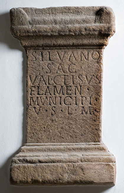 - Silvano / sac(rum) / Val(erius) Celsus / flamen / municipi(i) / v(otum) s(olvit) l(ibens) m(erito)